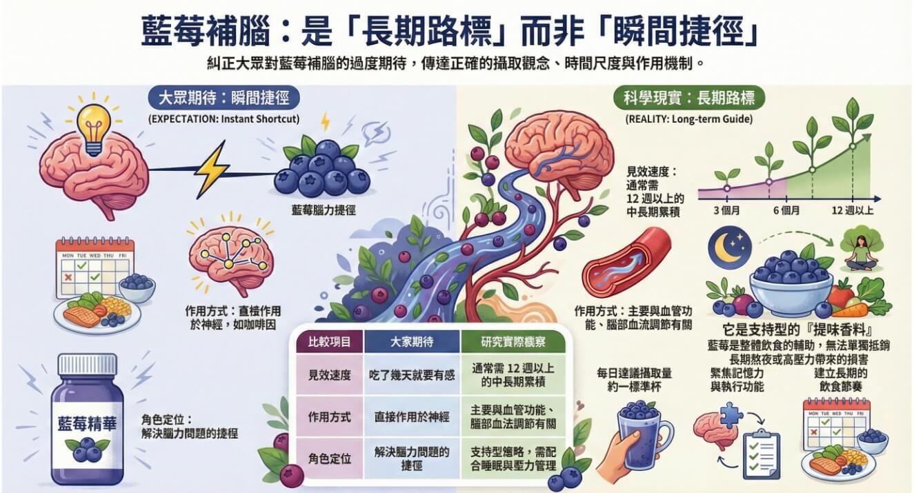 | 面向 | 多數人對「吃藍莓補腦」的期待 | 研究實際觀察到的變化 |