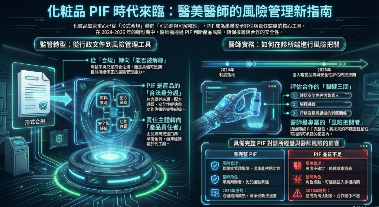 需要提醒的是,PIF 並不是萬能護身符。即便文件齊全,若安全性評估只是模板拼貼、缺乏實際暴露量與風險計算,仍可能在稽查時被視為無效。近年的國際回顧研究也指出,化粧品監管已越來越重視「結構化風險管理」與「上市後監測」,而非單點式的合規檢查(註1、註2)。這正是為什麼現在開始理解 PIF,對醫師來說不是多做功課,而是少踩一個未來會放大的坑。