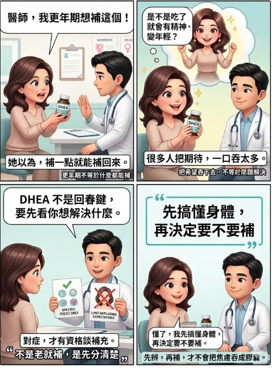 | 和其他治療的關係 | 願意先比較 DHEA 跟現有更明確治療選項的差異 | 把 DHEA 當成荷爾蒙治療的簡單替代品 | DHEA 是前驅物,不等於直接荷爾蒙治療,定位不同 |