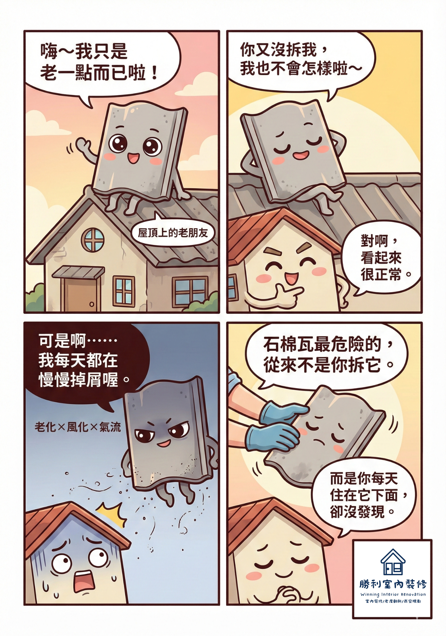 風險本質 把石棉瓦視為「空間風險源」,先釐清是否老化、是否有縫隙與氣流路徑 把它當「屋頂外觀」,認為沒拆就沒事,風險被忽略在空氣裡