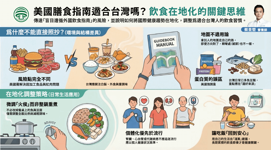 這篇文章要做的,不是否定美國膳食指南,而是把它翻譯成你在台灣每天吃得到、做得到的版本——看懂哪些原則值得借鏡,哪些地方需要調整,讓指南真正為你的生活服務,而不是反過來。