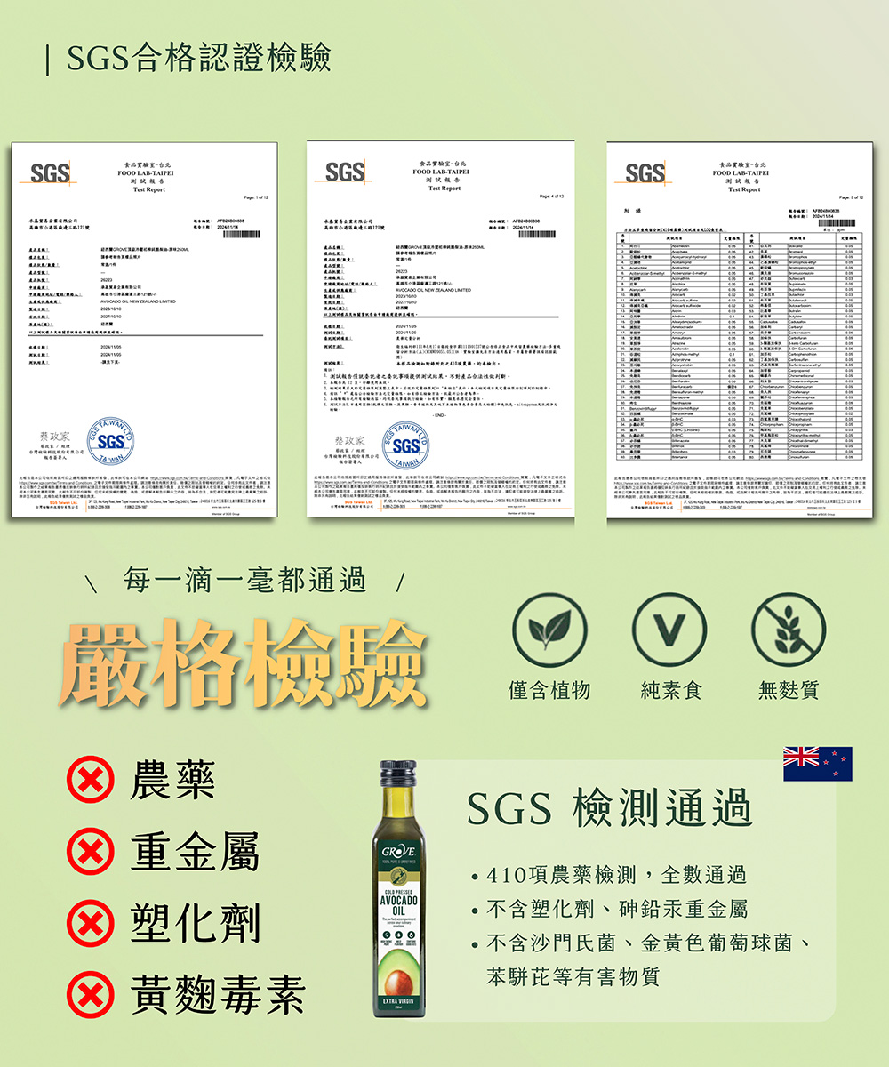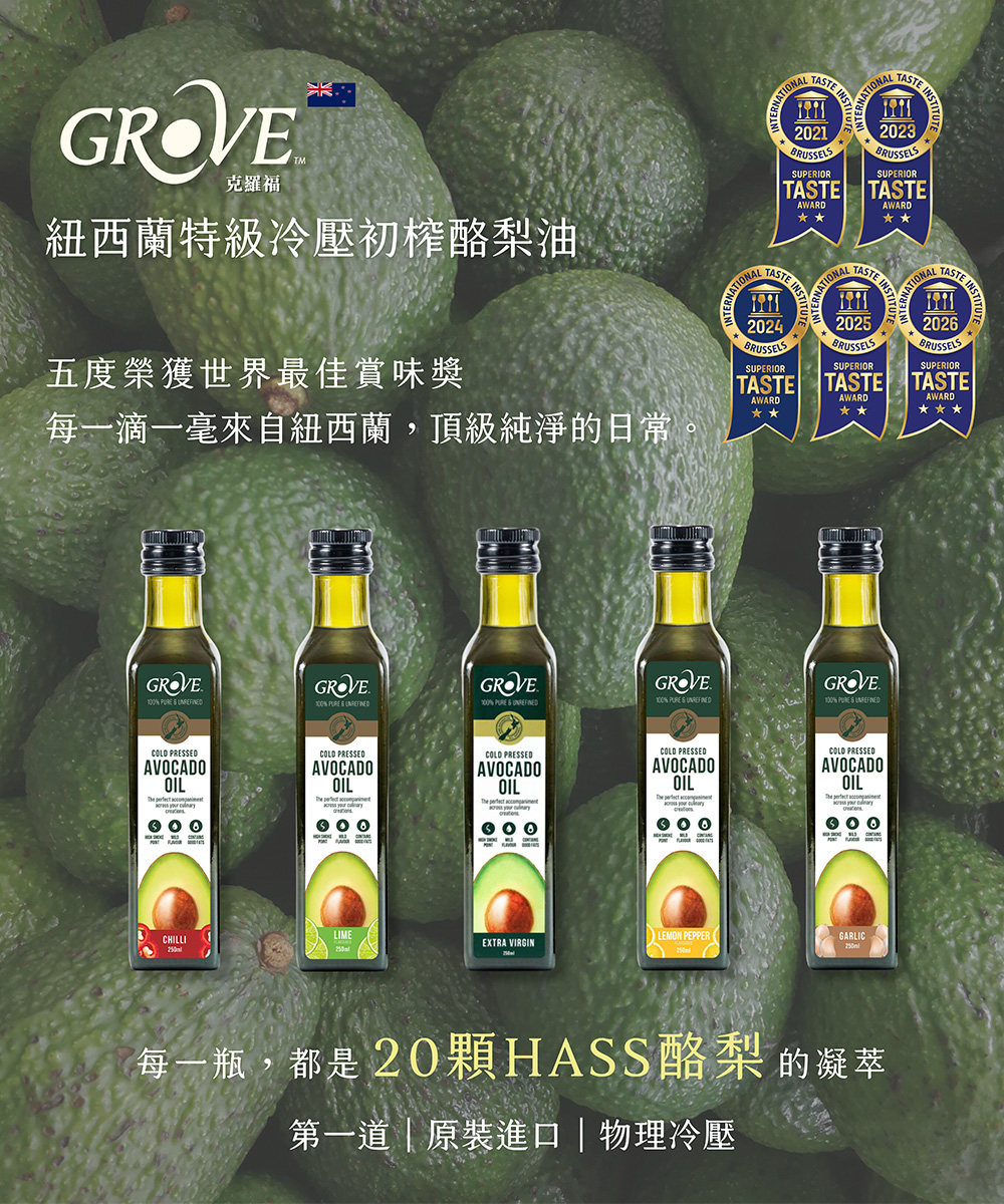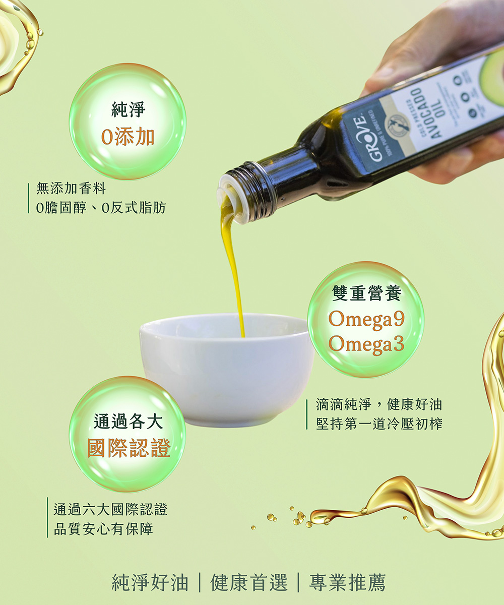 Grove 克羅福 頂級冷壓初榨酪梨油是「EXTRA VIRGIN」初榨等級的頂級酪梨油,嚴選紐西蘭豐盛灣優質酪梨,低溫冷壓製程,保留酪梨最初始的營養和淡淡的特殊奶油香氣,確保每一滴油都是真正的健康之選,高達 255℃ 發煙點,煎、炒、炸、烤都合適!